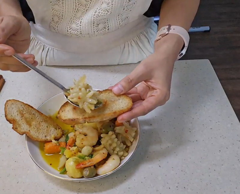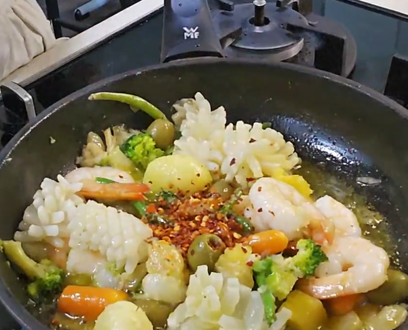 - 해산물을 넣고 자작하게 오일에 잠기도록 익히기
