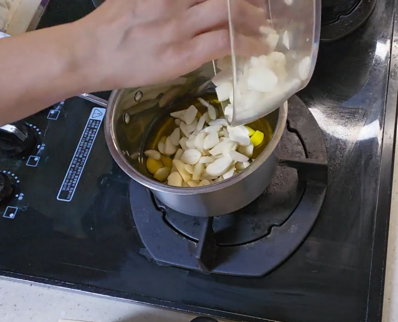 - 팬에 마늘과 오일을 함께 넣고 약불에서 10분 정도 익혀주세요.