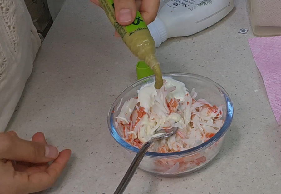찢은 크래미에 다음 재료를 넣어 잘 섞어주세요.