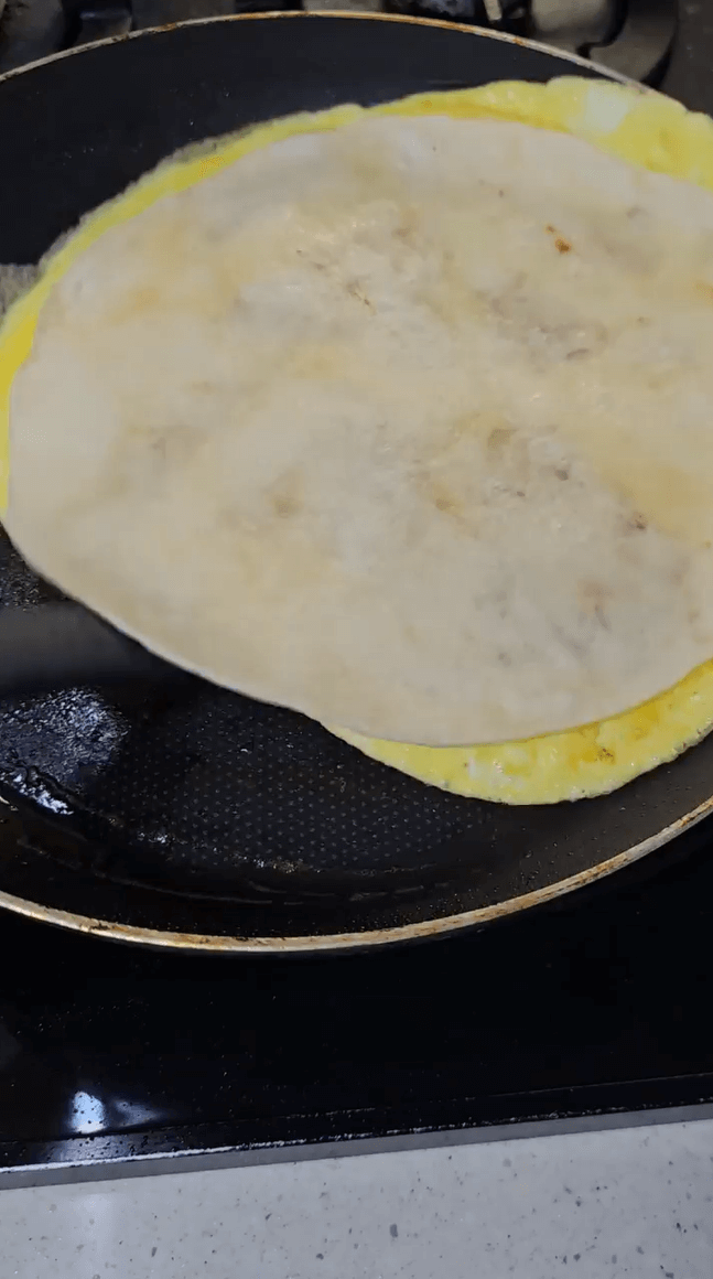 계란+치즈 위에 또띠아를 덮고