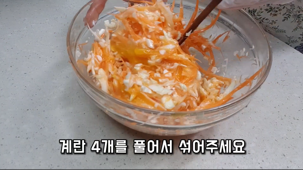 - 계란 4개를 풀어 함께 섞어요