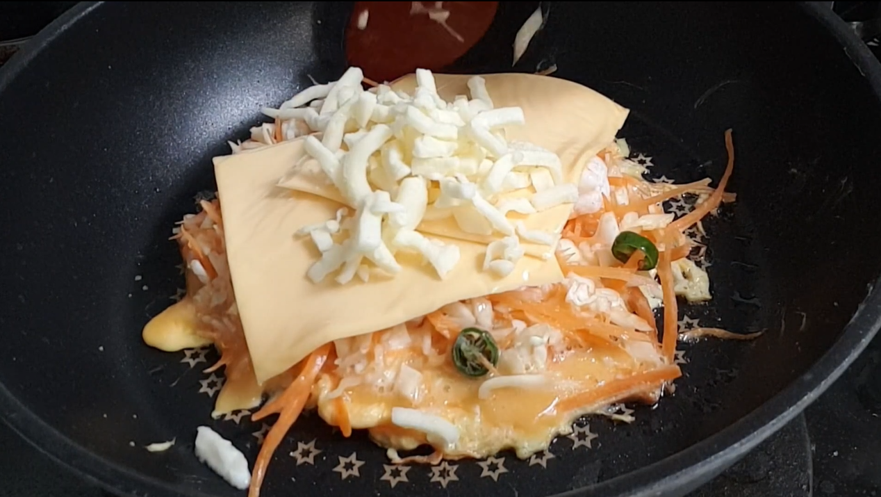 - 그 위에 슬라이스 치즈, 모짜렐라 치즈, 청양고추 등을 올려요